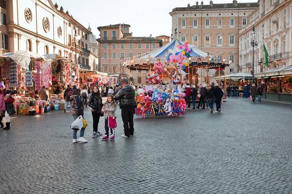 Italian Christmas MarketThere is a festive atmosphere during the whole of December. Christmas markets with various stalls with typical food, Christmas sweets and gifts can be visited in many towns especially in Italy's northern Alto-Adige Region. In the image above you see the Christmas market in Bolzano and the image below shows a popular Christmas market in Rome.