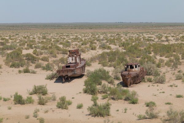 Shipwrecks in the dried up Aral SeaBy 2014, the eastern basin of the Aral Sea was completely dried up. This desert was created purely by poor environmental management and is seen as one of the worst environmental disasters.